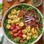 A vibrant and flavorful tortellini pasta salad featuring cheese tortellini, crispy bacon, fresh arugula, grape tomatoes, roasted red bell pepper, and a zesty lemon-garlic dressing. Perfect for a light lunch or a side dish at your next gathering.
