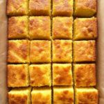 - Serve: When ready, run a knife around the edges to loosen. Lift the bars out of the pan using the parchment paper edges onto a cutting board. Cut into 24 pieces. Optionally, sprinkle additional powdered sugar on top before serving.