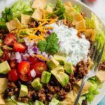 A flavorful and healthy Turkey Black Bean Taco Salad featuring a savory ground turkey and black bean mixture with bold spices, layered over fresh romaine lettuce, crunchy tortilla chips, cheese, and tomatoes, finished with a zesty salsa crema dressing. Perfect for a quick and satisfying dinner.